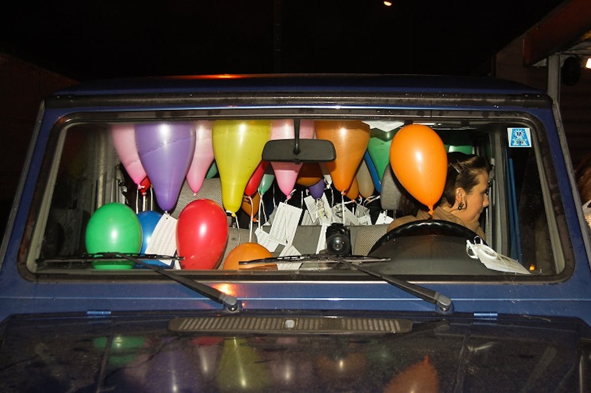 Wat een feestelijke lading! Don't try this at home. Beetje gevaarlijk toch. Als zo'n ballon ontploft. Of als die ballonnen een plotse aanval van claustrofobie krijgen, en ze alle paniekerig langs de voorruit eruit willen...