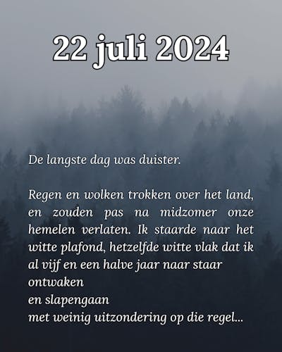 Het jaar was gewoon te zwaar. De jaren ervoor ook. Dus grijpt hij naar zijn vertrouwde houvast: werken en voortdoen en niet meer aan de toekomst denken, niet meer dromen, niet meer voelen, gewoon dag per dag overleven. Dat zorgt voor spanning en spanning bovenop het diep dal veroorzaakt kortsluiting, rare reacties die haar uit balans brengen omdat ze het allemaal nog niet goed kent. Eén keer, twee keer, drie keer. Muggen die in olifanten veranderen en teveel olifanten kunnen een ruimte verwoesten.Ze weet dat ze beter kan, dat ze nog wat kennis en ervaring mist om de muggen gewoon dood te meppen zodat de mooie ruimte heel blijft.Ze gaan slapen. Ze omhelst hem, voelt zijn liefde onder die zware last die hij al jaren draagt.Ze staat op en vertrekt met de kinderen, hij naar het werk. Ze krijgt een bericht: ik wil niet dat je terug naar huis komt vanavond.Het is definitief voorbij. Laat me nu gerust.We spreken nog over hoe we het praktisch regelen.Ze gelooft het niet, maar weet dat het nu geen zin heeft te reageren.