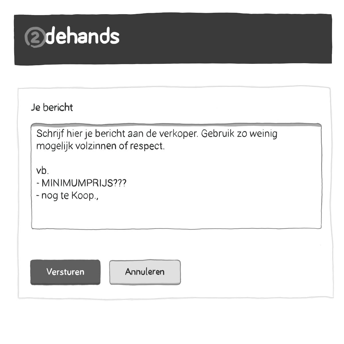 Was het uitroepteken in m'n antwoord te agressief? De smiley te sletterig? Terwijl er onzekerheden bovenkomen die je niet meer gevoeld hebt sinds je ergens begin 2000 sms'te naar een nummer dat je op een fuif had losgepeuterd, loopt de volgende melding al binnen. Deze keer met de andere openingszin waarmee de chatservers van 2dehands gevuld zijn: ‘Wat is je minimumprijs?’ Hier heb je wat ik het niemand-heeft-me-ooit-uitgelegd-hoe-bieden-werkt-type noem. Waarom zou je ook dat tijdsintensieve spelletje spelen en bod na bod over en weer kaatsen als je op de man af kan vragen hoe wanhopig de verkoper is. De ergste gevallen van deze soort hebben zelfs het lef om, nadat je de minimumprijs hebt gegeven, tóch nog af te bieden. Ga hier alsjeblief niet in mee, tenzij jíj graag aan de mensen van Van Dale uitlegt waarom ze hun boeken opnieuw kunnen drukken omdat je de definitie van het woord 'minimum' waardeloos hebt gemaakt. Maar vrees niet, de meeste van deze idioten geven het op als je hen voldoende hard verwart. Een simpele ‘Zazawie!’ antwoorden op alles wat deze persoon je verder vraagt zou in dit geval dan ook moeten volstaan.