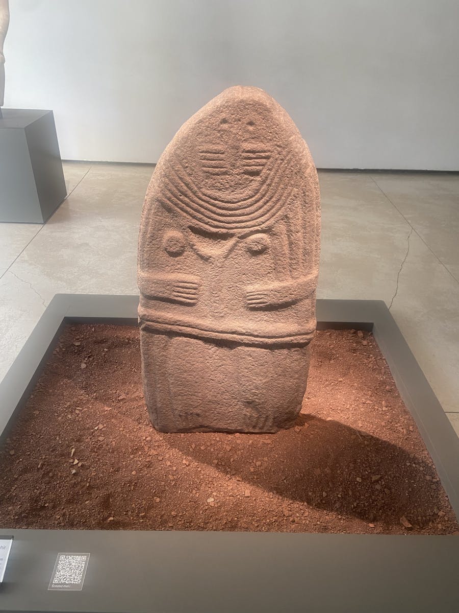 In de wereld van de menhirs zien alle vrouwen en mannen er hetzelfde uit. De mannen dragen een ‘baldric’, een overlangse riem voor een wapen. Waren het helden, goden of hoogwaardigheidsbekleders? Het blijft een mysterie. Door hun eenvoud spreken ze me meer aan dan de gepolijste standbeelden uit de Grieks-Romeinse tijd of het classicisme. Bij de menhirs mag ik meer zelf invullen als kijker. Net als bij het houten Mariabeeld uit de dertiende eeuw. En het hoofd in kalksteen dat vroeger onder een balk aan een gevel hing, kijkt je zo indringend aan dat je je wil verbergen. Kunst zonder tierlantijntjes legt onze drijfveren bloot, net als een gesprek zonder protocol.