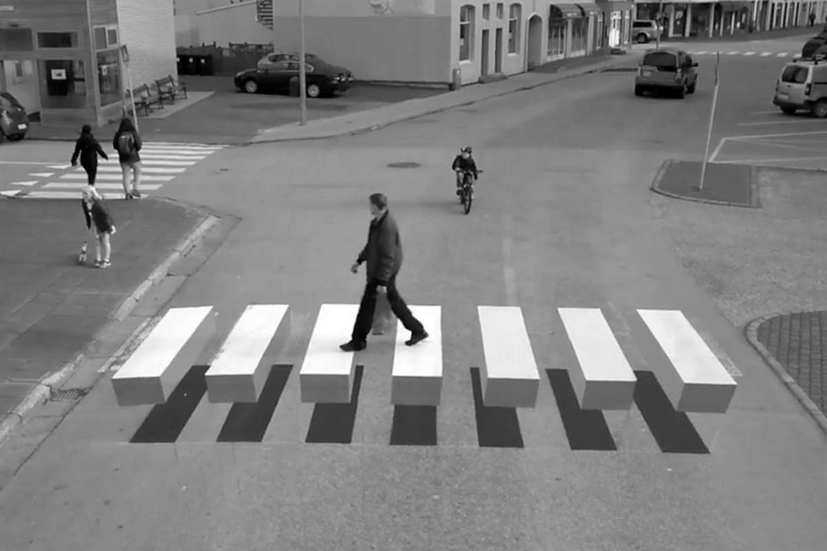 Inmiddels stapt de heer Maurits Cornelis Escher gezwind over zijn driedimensionaal zebrapad en stelt de verbijsterde moeder en haar dochtertje gerust dat er niets kan gebeuren.