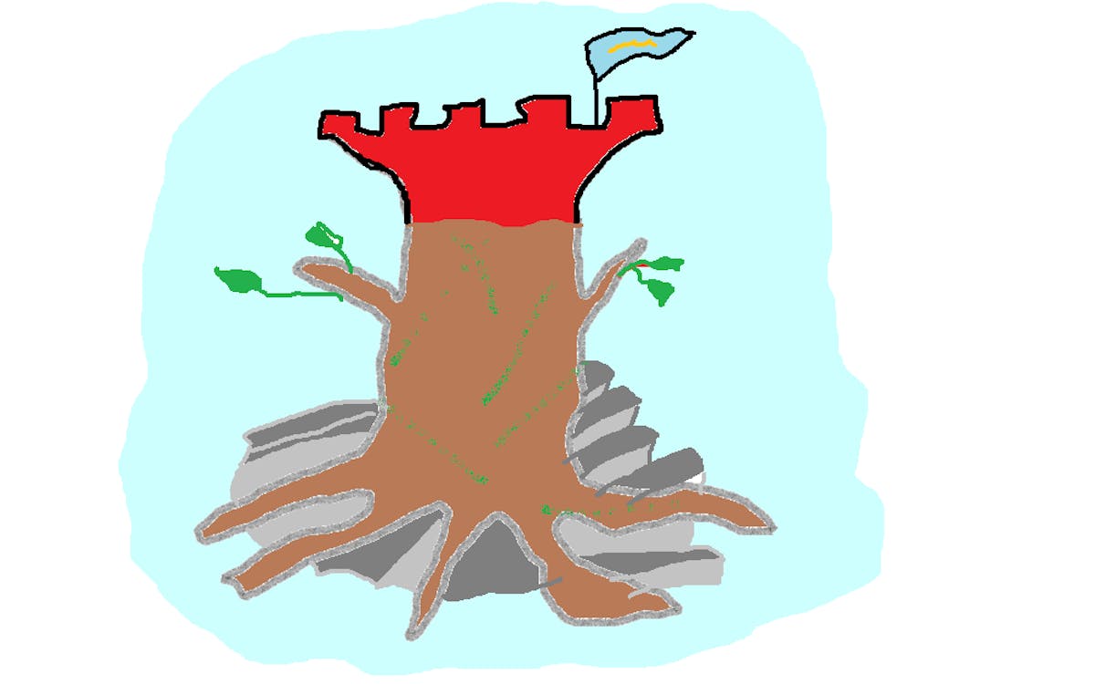 Met zessen staan jullie paraat om de burcht te bestormen. De boom is de imaginaire toren die moet beklommen worden. Elke wortel is een trede.