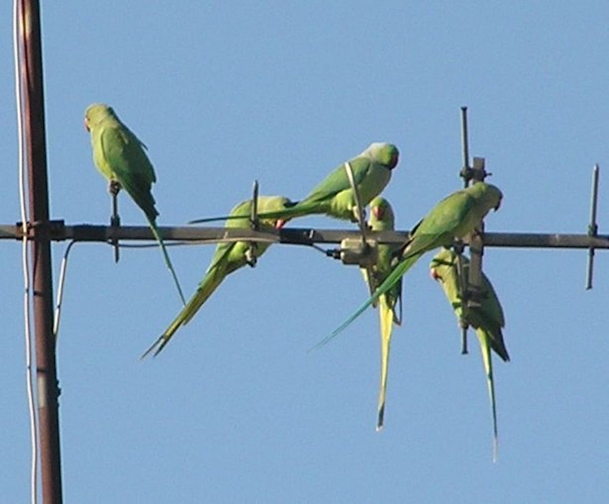 Het is nog koud. Een kibbelend koppel wandelt langs. Een hond blaft. Niemand ziet hoe een troep felgroene parkieten plots voorbijraast, een luid krijsende streep in een grijs stadszicht; het eerste groen na een strenge winter.
