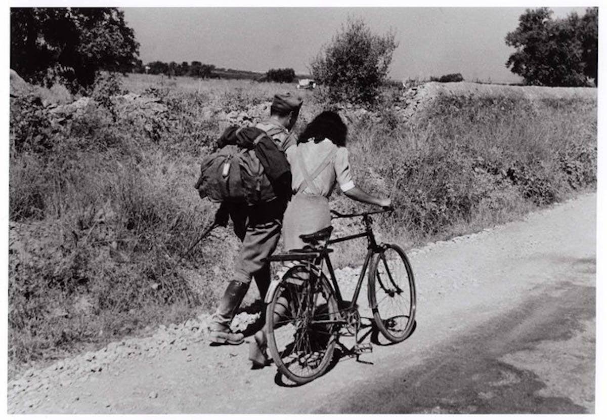 Ken je dat gevoel, wanneer je een oude zwart-witfoto ziet en er een verhaal bij verzint? Bijvoorbeeld deze jonge vrouw op een fiets, lach op haar gezicht, haren in de wind terwijl ze door de velden rijdt. In het landschap staan verwoeste boerderijen en uitgebrande legervoertuigen. De hemel – op de foto grijs, maar daar kijk je doorheen – is stralend blauw.