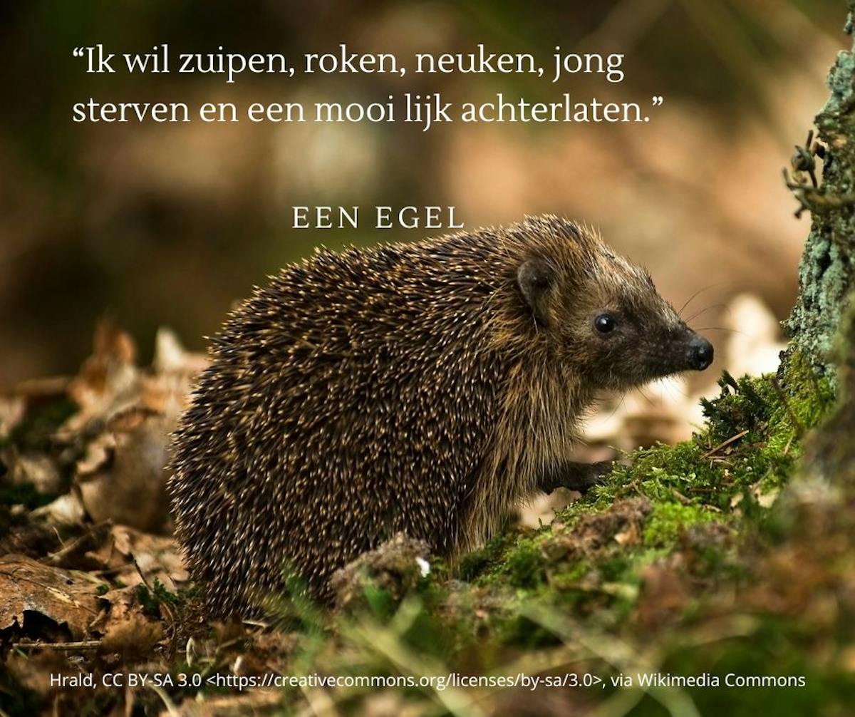 “Jouw Grote Verhaal kan me gestolen worden”, zegt de egel, “Ik wil zuipen, roken, neuken, jong sterven en een mooi lijk achterlaten.” Hij ontdoet zich van zijn tiendelige beha en steekt over naar de andere zijde van het bospad, vanwaar hij wordt gadegeslagen door een bronstige das. Hij schudt met zijn talrijke borsten en laat de das aan zijn tepels snuffelen. Voor hij zich terugtrekt in de dassenburcht draait hij zich nog eenmaal om. “Jullie zijn allemaal hetzelfde, met jullie menselijkheid“, zegt hij, “Knoop dit goed in je oren, haarlakker: Ik ben geen mens, maar een egel.”