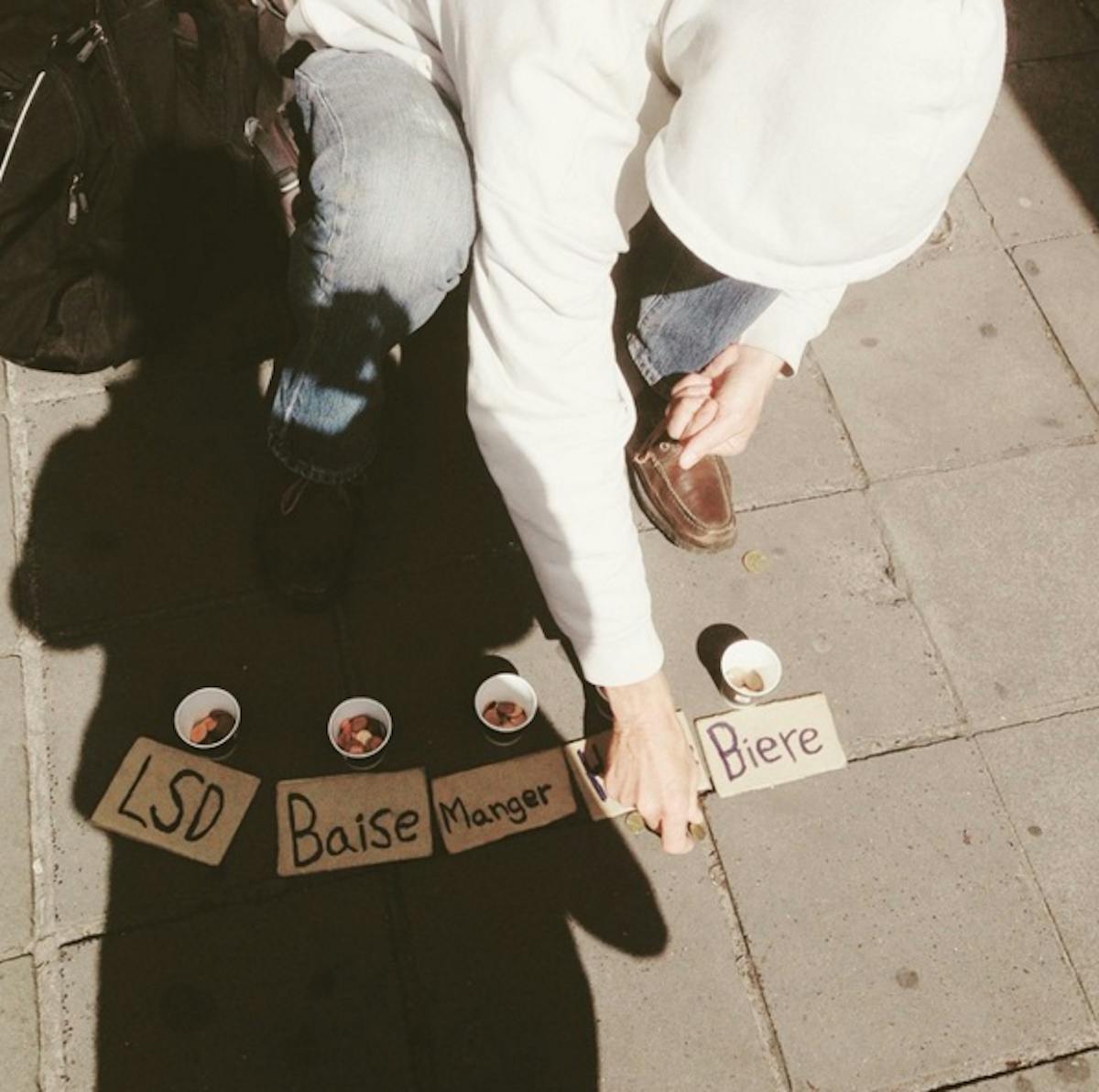 Aan de voorgevel van de McDonalds zit een bedelaar. Voor hem staan vier plastieken bekertjes met elk een naambordje. De bedoeling is dat mensen er geld in gooien. Eén bekertje heet drugs, een LSD, een bier en bij de vierde beker gaat de opbrengst naar eten. Ik gooi een paar rosse centen in het bekertje voor bier en vraag of ik even een foto mag nemen. ‘Bien sur mon amie!’ Hij gooit zijn armen in de lucht en glimlacht. Door de zon weerkaatst de schittering van zijn gouden tand in mijn ogen.