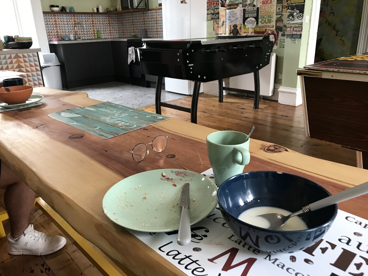 Intussen kan een van de vele buitenlandse jobstudenten die het management van dit hostel overeind houden, het serene karakter van het ochtendgebeuren niet meer aan en zet de radio op. Nu hebben we zeker geen reden meer om te beginnen met praten, want anders horen we de muziek niet meer.