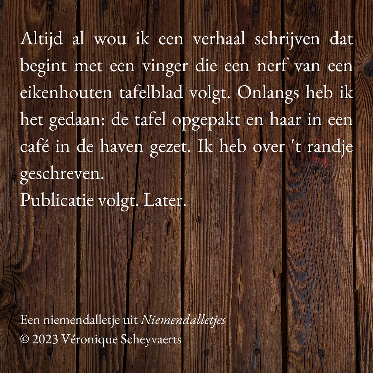 Altijd al wou ik een verhaal schrijven dat begint met een vinger die een nerf van een eikenhouten tafelblad volgt. Onlangs heb ik het gedaan: de tafel opgepakt en haar in een café in de haven gezet. Ik heb over 't randje geschreven.