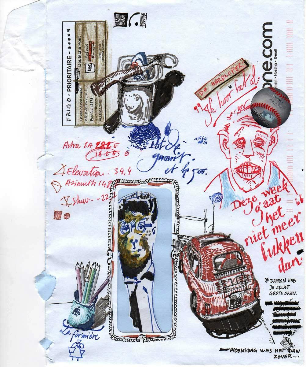 Een standaard witte envelop, A5 met venster, lag al dagen op mijn werktafel. Ik noteerde allerlei kleine zaken erop zoals telefoonnummers, namen, een adres en wat droedels. Een enkele keer kuiste ik mijn vulpen al schuddend boven zijn oppervlak en probeerde ik een nieuwe kleur inkt uit op zijn stevig papier. Ik dacht hem weg te gooien en verzamelde nog wat knipsels in de omslag die her en der verspreid lagen. Zijn lot was bezegeld tot die laatste blik voor hij de prullenmand inging. In een oogopslag kreeg ik het overzicht van een verhaal dat ik in handen had: een oude FIAT 500, een magere man met een oog dat dicht zat alsof hij er net een bal in had opgevangen, een potje yoghurt, en achter het venster een knipsel uit een mislukte illustratie die een opdringerige makelaar voorstelde. Het beknopt overzicht van de voorbije week die achteraf toch bijzonder boeiend was gebleken.