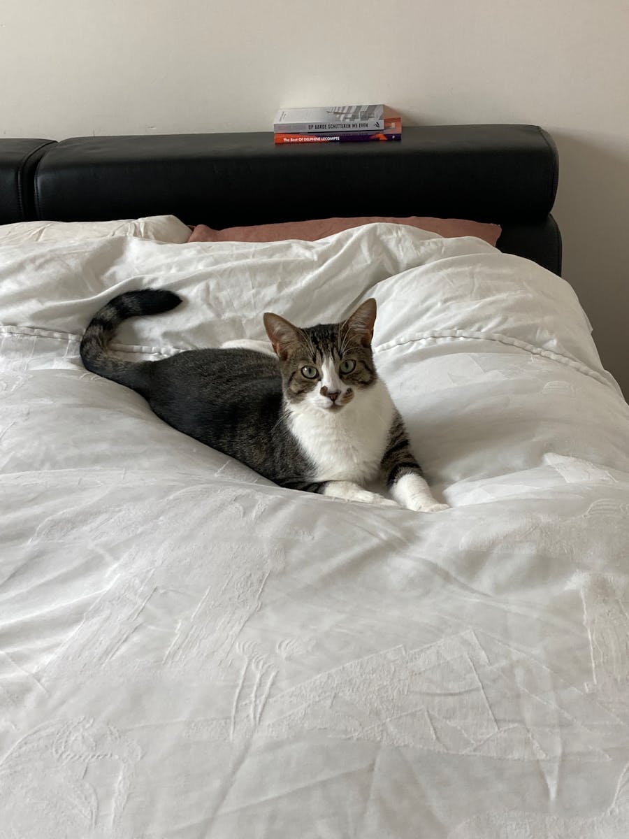 De ogen tot spleetjes geknepen, zet de kater spinnend zijn nagels in het Egyptisch katoen. Als je niet beter wist, zou je denken dat hij lacht.