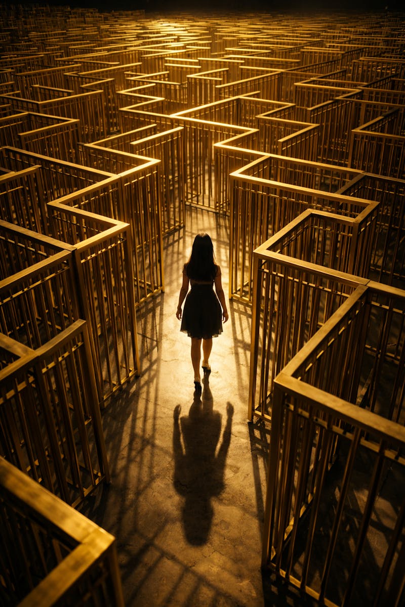 Gevangen in mijn eigen gedachten, slenter ik door het lege labyrint van mijn leven. Eenzaam dool ik door doodse gangen en lege kamers die stilte echoën. De hoge muren die ik zelf heb gebouwd, vormen het fundament van mijn zijn.