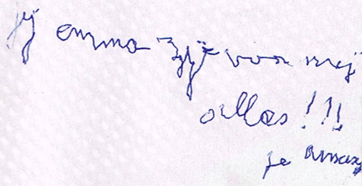 In zijn geschrift ontwaar ik even nog een poging om de letter z te handletteren, het creatief vormgeven. Heel typisch voor mijn vader. Met zijn laatste energie die traag uit zijn lichaam stroomde heeft hij nog krachtig 3 uitroepingstekens geplaatst achter het woordje "alles". Een heel overtuigend signaal.