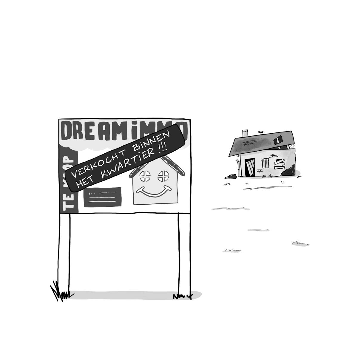 Is het je de laatste tijd al opgevallen hoe immokantoren altijd maar arroganter uit de hoek komen? Meer en meer blijven te-koopborden van verkochte woningen weken staan, om misbruikt te worden voor de zelfophemeling van het kantoor in kwestie. Stickers in schreeuwerige kleuren verkondigen de recordtijd waarin het onroerend goed verkocht werd, alsof ze willen zeggen: 'Kijk eens wat onze Guillaume hier heeft klaargespeeld. Verdient dat geen applausje?' Zo heeft Immo Vermortel een charmante, instapklare eengezinswoning 'verkocht binnen de maand'. Vastgoedkantoor Van der Steen, zo vertelt de sticker me, deed het beter en wist een rustieke villa in volle natuur 'IN MINDER DAN EEN WEEK!!!' van de hand te doen. Mij doet het allemaal wat te hard denken aan de politiekers die, weken na de verkiezing, met een bek vol scheve tanden en een bedanktsticker naast hun voorhoofd nog altijd zielloos in de leegte hangen te grijnzen.