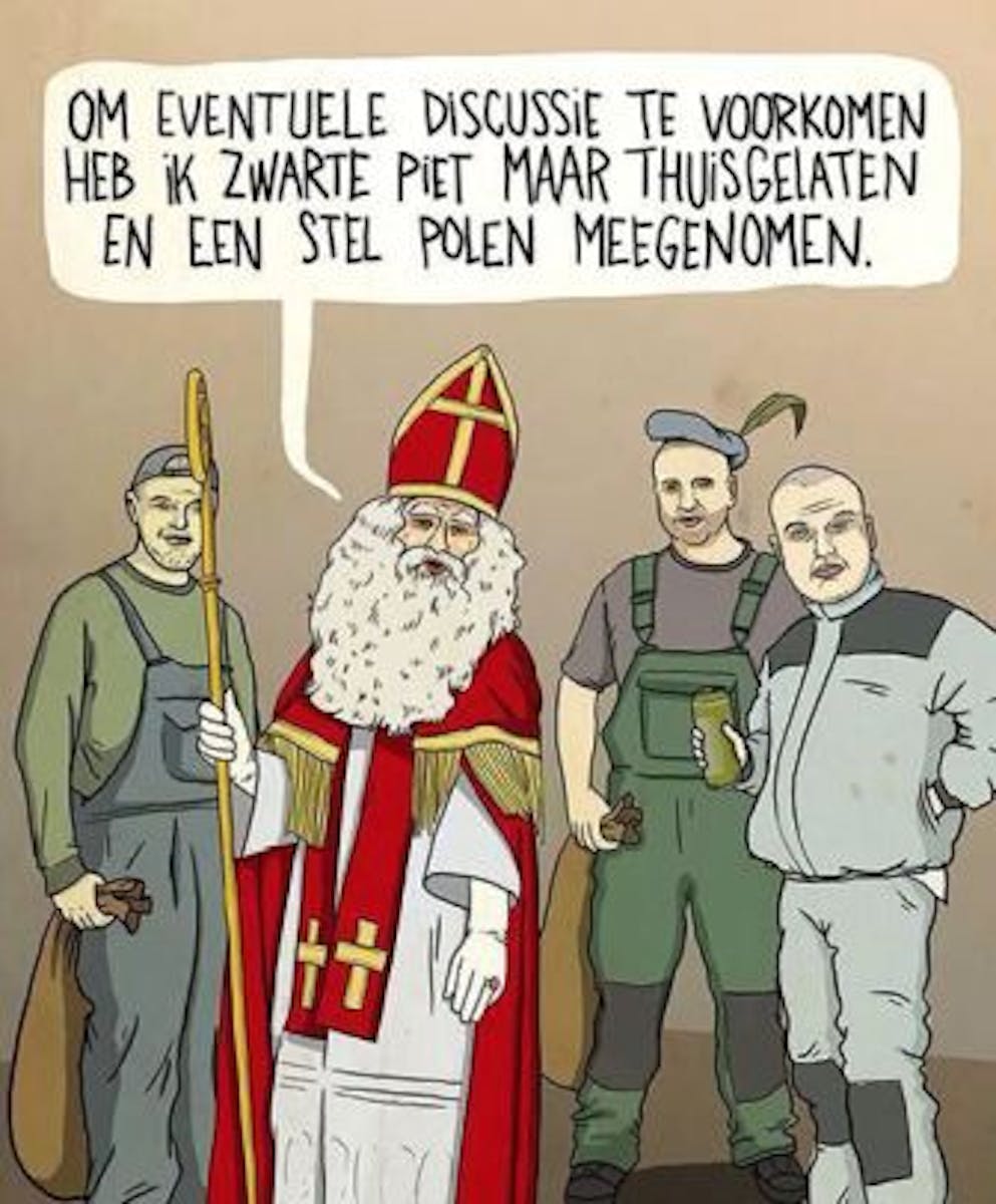 Het zijn nog maar net de laatste dagen van augustus en de Nederlandse kranten berichten weeral over de in aantocht zijnde Sinterklaas. De facebook- pagina’s staan opnieuw bol met verhalen van de voor- en tegenstanders van de Zwarte Pieten. Ik vraag me af of de Sint het gezeur van de door racisme aangesproken kersverse Europese burgers niet stilaan beu wordt. De nieuwe ingevoerde Nederlanders en Belgen verwachten, nadat ze zelf een jaar van pseudo- inburgering achter de rug hebben, dat ze het recht hebben, om al onze westerse tradities probleemloos te laten verbieden. Ze zijn gewoon jaloers omdat de Sint nooit in de moskee komt..want daar staan veel te veel schoenen om gevuld te worden. Als wraakneming op het verbod op het dragen van hoofddoekjes in de scholen, verwacht men dat er als tegenprestatie nu ook geen kerstboom meer mag gezet worden. Varkensvlees mag er niet meer als schoolhap aangeboden worden en de Zwarte Pieten van Sinterklaas, zijn al sinds jaren, zogezegd een doorn in het Afrikaanse oog. Decennia lang kwam Sinterklaas met zijn Zwarte Pieten in onze westerse beschaafde wereld met de stoomboot aan. Een traditie waaraan niemand aanstoot nam of er ook maar bij stilstond, dat Zwarte Piet nu wel of niet een racistisch item was. De Sint was de Sint en Piet zijn helper. Ook de zwarte bevolking in België zag er jaar en dag geen graten in. Ze vonden het zelfs leuk dat er voor hen zo’n prachtige bijrol ingecalculeerd werd. Alleen vanuit de hoek van onze noorderburen waait de term “racisme” telkens weer opnieuw onze richting uit.