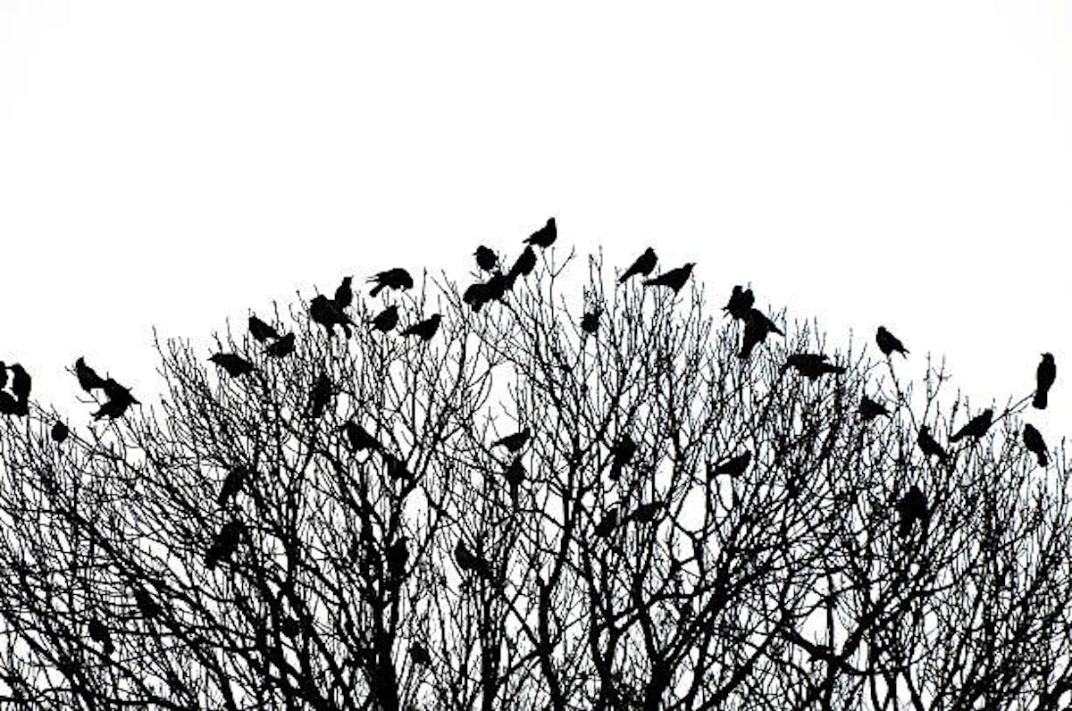Ook kauwen blijken echte acrobaten in de lucht en ze draaien in wilde gesynchroniseerde golven rondom de bomen. Misschien vertellen ze elkaar over de belevenissen van de voorbije dag, de jachtsuccessen, of ruziën ze gewoon voor een slaapplaats in de bomen.