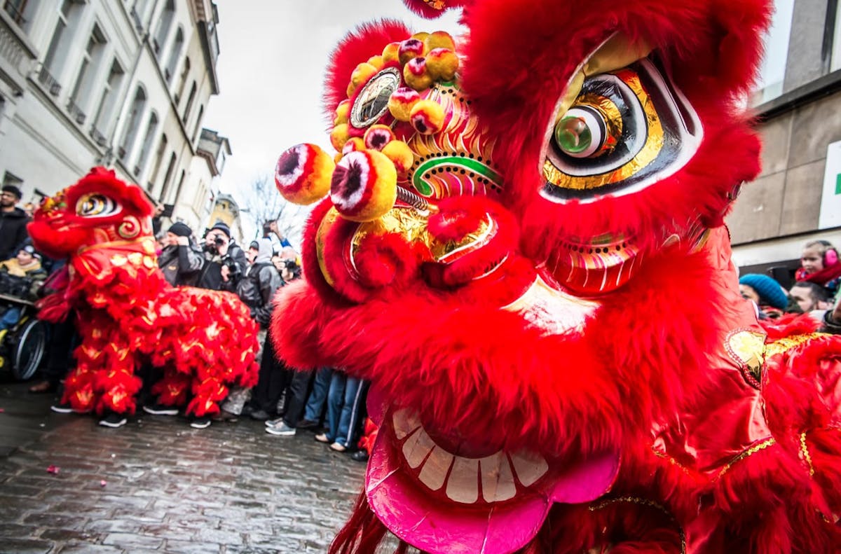 De hele straat is gevuld met mensen. We schuifelen ons erbij. Ik zet me op de tippen van mijn tenen. Het geroffel van een grote trommel komt dichterbij. Gongs en cimbalen geven het opjagende tempo mee aan. De menigte verdeelt zich in twee en kiest elk een kant van de straat.