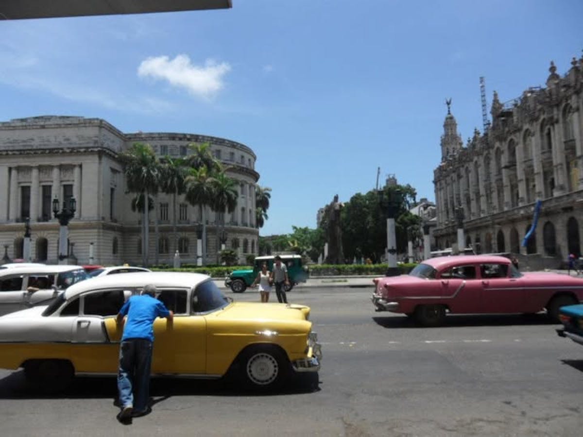 Mijn eerste herinneringen aan Cuba zijn bewegingen: de trage majestueuze cirkels van de roodkopgieren en valken, de oldtimers die zonder vroemen voorbijglijden. Onze Chinese bus geeft voorrang van links aan paard en kar. In de berm van de autostrade hangen magere paarden aan een koordje. Het Italiaanse koppel naast me maakt ruzie. 'Ti sbagli!', schreeuwen ze tegen elkaar. Ik probeer ze te negeren en maak foto’s van het landschap, van de mensen, van revolutionaire spreuken op de huizen. De majestueuze gevels en pleinen van Havana zijn prachtig, net als de oldtimers.