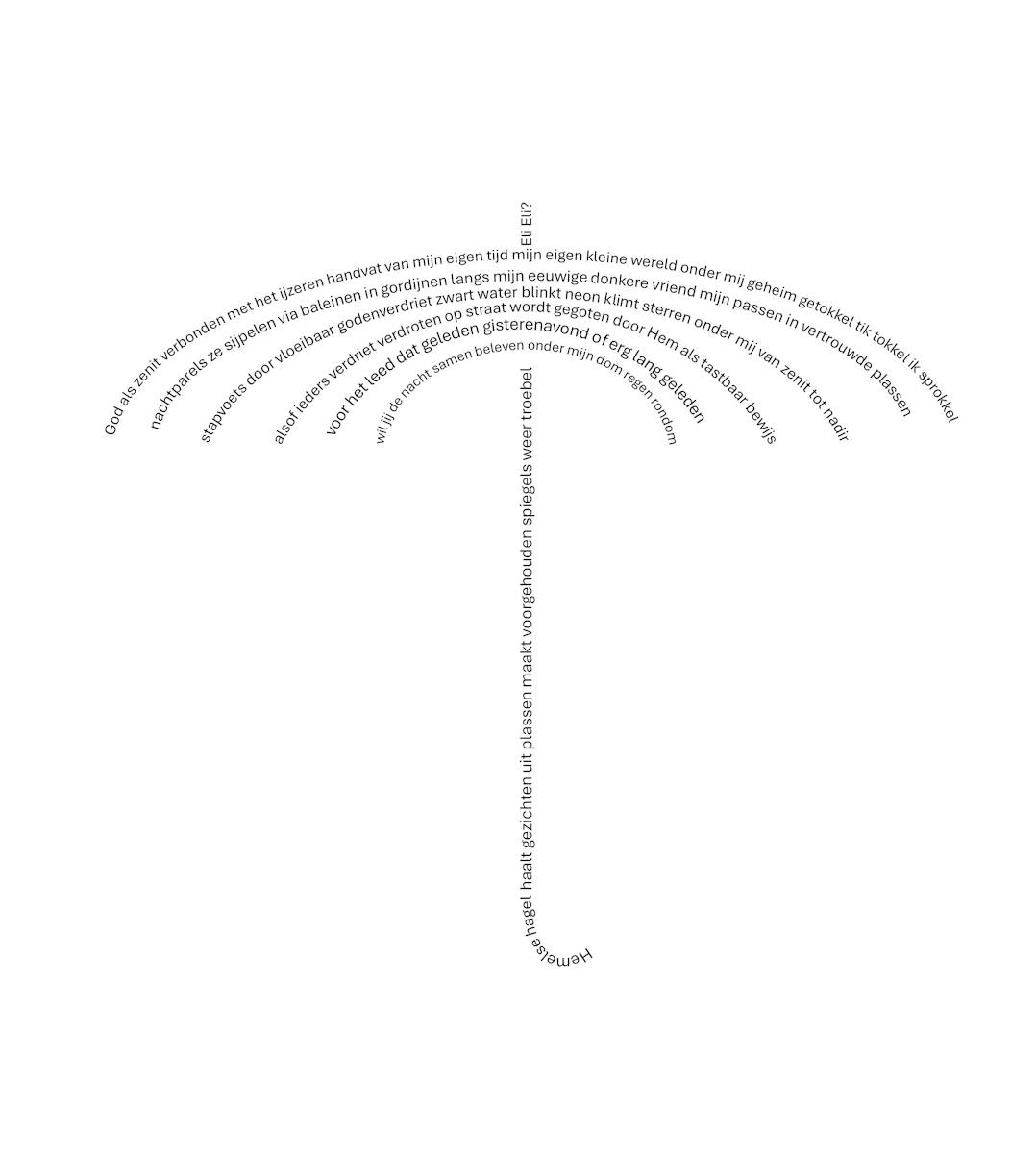God als zenit verbonden met het ijzeren handvat van mijn eigen tijd mijn eigen kleine wereld onder mij geheim getokkel tik tokkel ik sprokkel