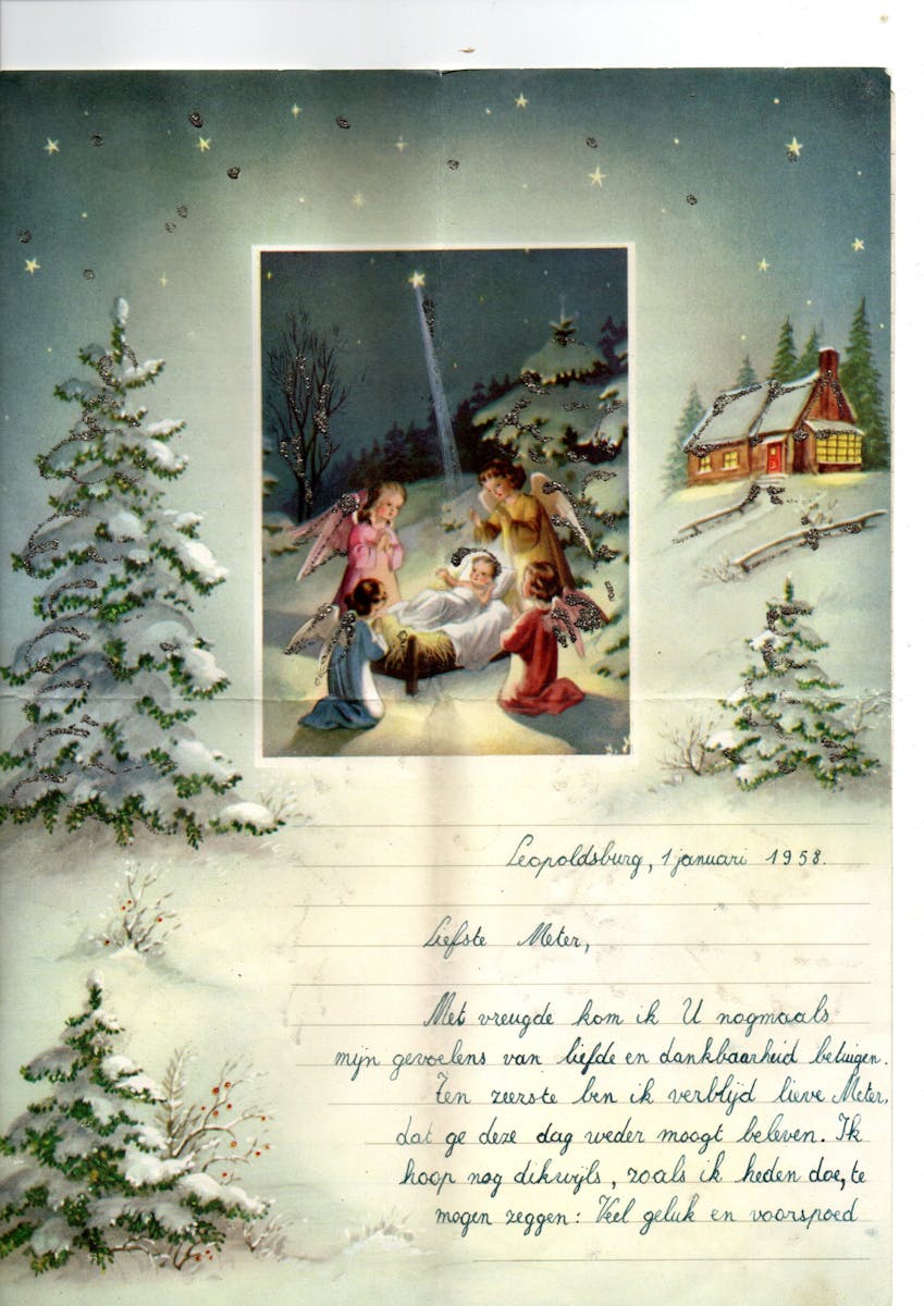 Wat was jij prachtig toen ik aan de doopmeter van mijn bezitter de allereerste nieuwjaarsbrief schreef. Jij schitterde gewoon, met jouw zilveren sterretjes en kleurenprenten van kinderen die speelden in de sneeuw. Mijn geschrift was mooi, maar beverig en ook al had ik alles eerst in klad voorgeschreven maakte ik toch een foutje, dat ik dan maar doorstreept heb. Hoe gek klonk de beleefdheidsformule die ik van mijn tienjarige eigenaar moest schrijven: ‘Uw toegenegen doopkind’. Daar heb je vast mee gelachen, net als met dat rijmpje dat ik voor de grap schreef: Liefste meter, één centje is goed, twee centjes zijn beter.