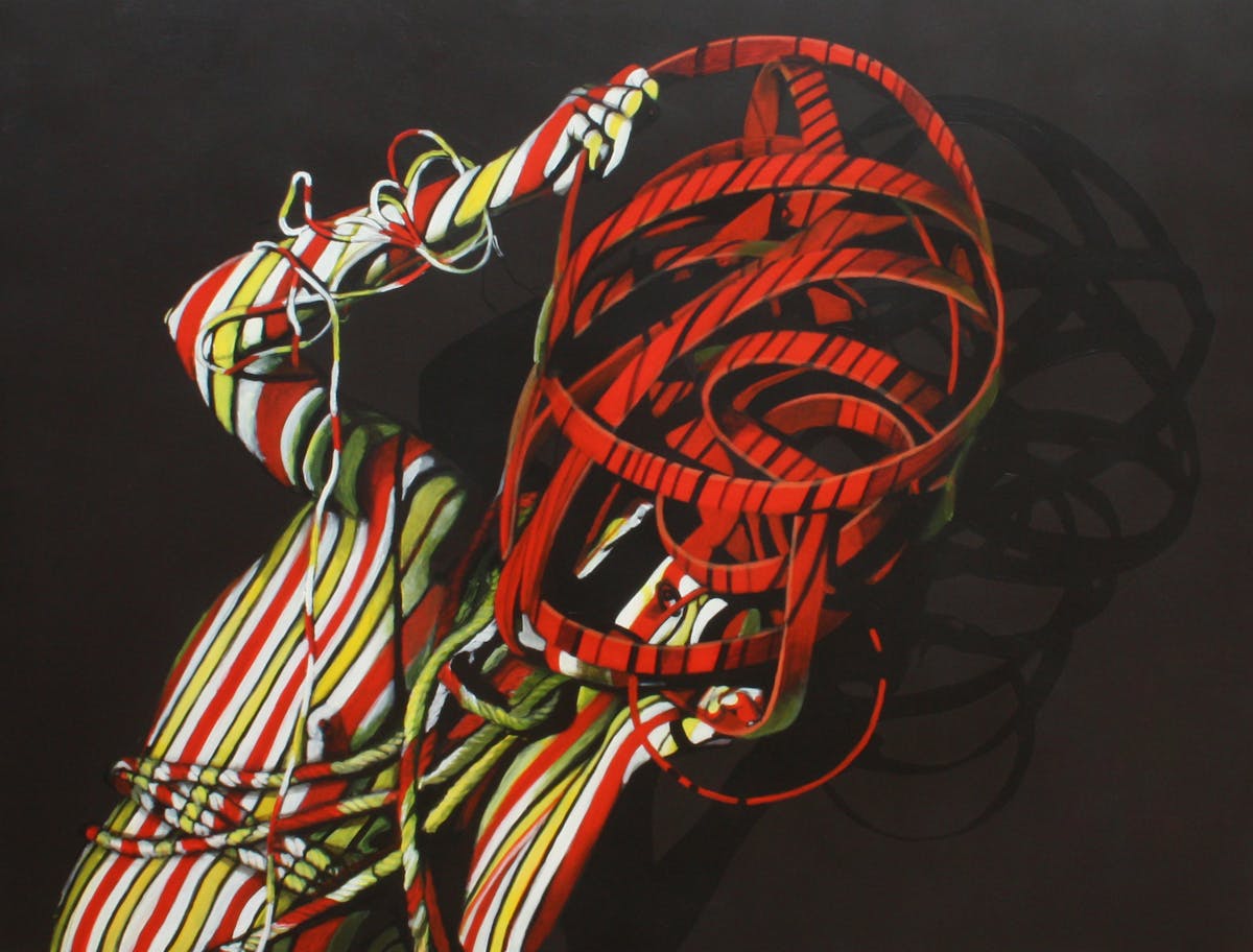 Het zijn enkele voorbeelden van collectief ingebedde ‘ja, maars’ die niet eigen of authentiek zijn. Het zijn overtuigingen die als een beperkende koord rond de vrije wil zitten gewikkeld. En rond het natuurlijke zijn. Ik ben mezelf al jaren aan het bevrijden van het kluwen aan beperkende overtuigingen dat mijn ware zelf belemmert. Ik begrijp nu ook ineens waarom ik mezelf zo vaak gewikkeld in touw heb geschilderd. Via kunst, of dat nu schrijven, zingen, schilderen, dansen of spelen is, krijgt het onderbewuste een podium. In onze creatieve uitingen lezen we wat er onder de vele lagen van overlevingsstrategieën echt speelt.