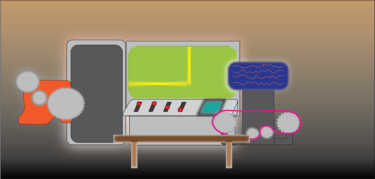 Het lijkt het depot van het museum voor ouwe meuk. Jarenvijftig machines met hendels en tandwielen wisselen primitieve computers met groene beeldschermen af. Een afgeleefde houten werkbank ligt vol met roestige onderdelen van mechanische en elektronische rommel. In een rek aan de achterwand, naast een grijze metalen kast, hangen zagen, schroevendraaiers, beitels en allerlei vage gereedschappen. Ik krijg het beeld van een middeleeuwse martelkerker, welliswaar enigszins gemoderniseerd en gestileerd, maar blijven hangen in de rock-'n-rolltijd.