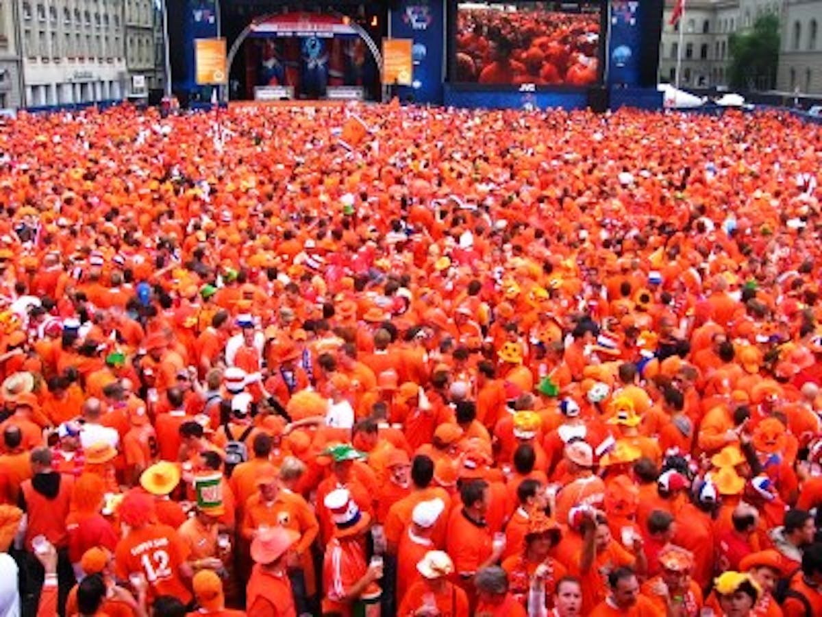 De volgende traditie zou ik eender onder de noemer carnavalsgekte willen catalogeren. De Nederlandse oranjegekte. Wie hiermee begonnen is mag Joost weten, maar blijkbaar weet Joost dus ook niet alles. Bij alle mogelijke traditionele optochten, zoals de circusvertoning op Koning(inne)dag , tooit heel Nederland zich eensgezind in oranje. Heel der straten worden oranje geverfd en sinaasappelkleurige idioten zwaaien zichzelf een tenniselleboog als de Koninklijke poppenkast in een gouden koets voorbij komt rijden. Erger wordt nog de oranjegekte bij voetbalwedstrijden. Hier tooien ze zich met kaasbolhoeden, façon Beatrix, allerhande petten met Hollandse molentjes en hup, Holland hup bustehouders. De oranjemeute gaat, met de Hollandse driekleur op het aangezicht geschilderd, op het oorlogspad. Ze drinken zich het apelazarus, slopen vervolgens na de voetbalnederlaag, bloeddorstig, hele stadscentrums en laten een oranje vernielspoor achter zich. Mogelijk krijgt dit soort tradities stilaan ook voet aan wal in België, want toen de Rode Duivels weer als ‘de Belgische super glue’ opgevoerd werden, scandeerden, riepen, vochten en zopen, een heleboel als duiveltjes verklede en met de Belgische driekleur vol gekliederde Vlamingen en Walen, zich gebroederlijk onder tafel.