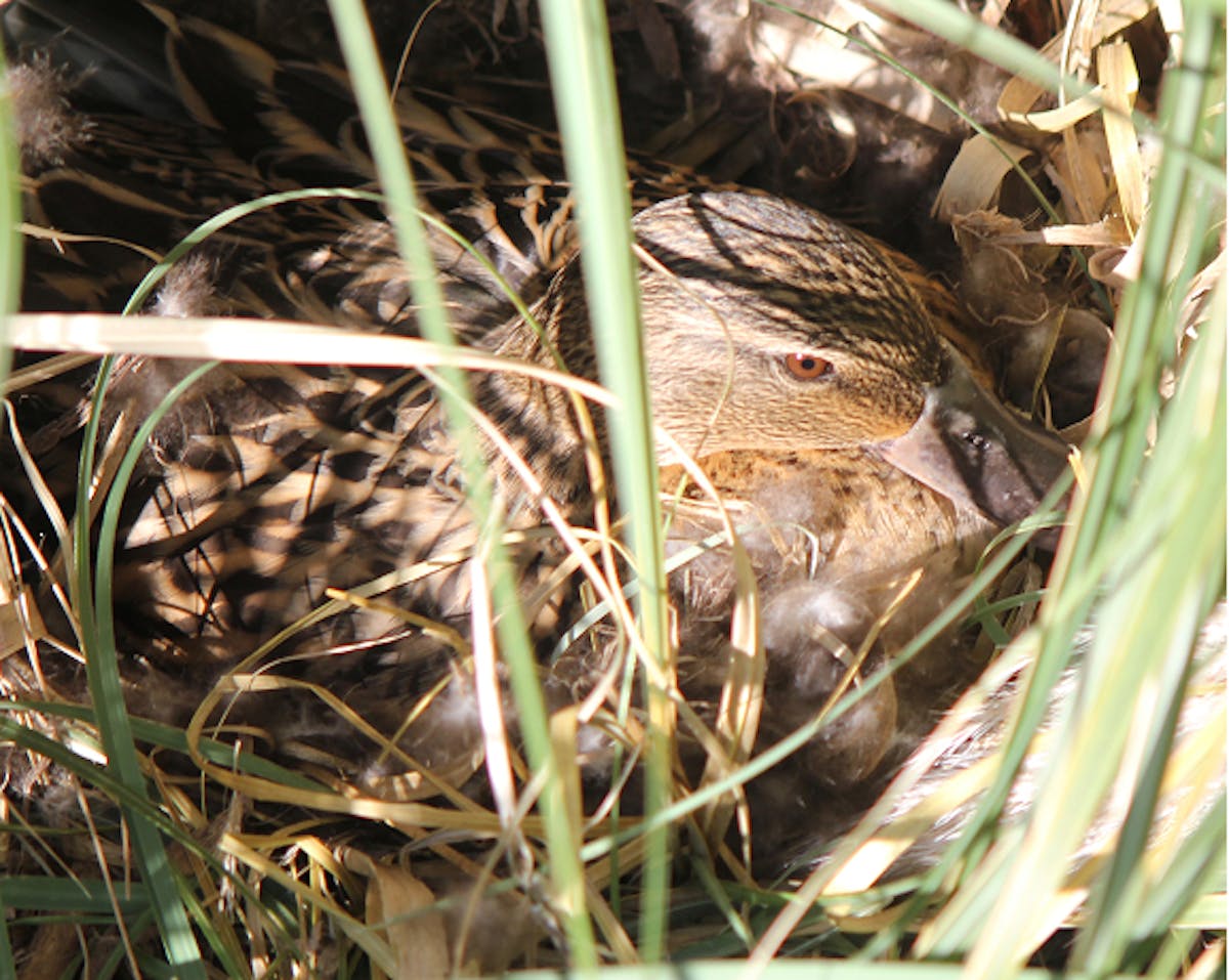 Zo tegen Pasen. Tijd om te snoeien. Voor mijn deur staat manshoog het pampasgras (papas-gras zei vroeger mijn dochter). Halfweg de dikke struik kijkt nu een gebiologeerd oogje mij aan. Doodstil zit de bruine eend middenin de rietachtige stengels. Ik kan alleen maar vermoeden hoe hard dat moederhartje klopt. Zien doe ik het niet. Eenden-ogen knipperen niet, verpinken niet. Haar pluimen gaan niet uit de bol. Niet recht omhoog. Alleen stilte en onbeweeglijke roerloosheid. Hetgeen tweemaal hetzelfde is, maar dat mag. Want het is. Haar oog staart mij blijvend aan. Het zegt: ík blijf zitten. Zij blijft zitten. Ik haal een bakje water. Wat eten eenden? Als een idioot leg ik er een snee geweekt brood bij. En dan laat ik haar. Respect.