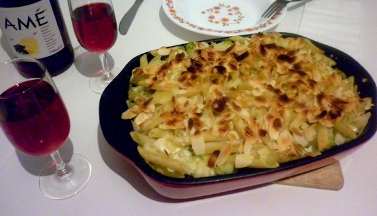 de ovenschotel met amandelschilfers