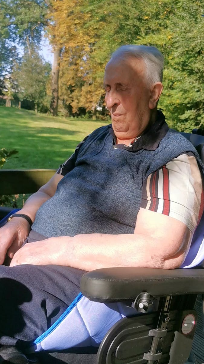 Maar net als het gemoed richting melancholie schuift, ontdoet hij zich van zijn slaap en maken we connectie. Gewoon even lachen en laten weten dat het goed is. We wisselen een paar woorden en een achterkleinzoonvermelding doet zijn belegen staarders fonkelen. Straks kan die kleine wandelen en heeft de beuk een nieuwe tak om levensvreugde aan op te hangen.