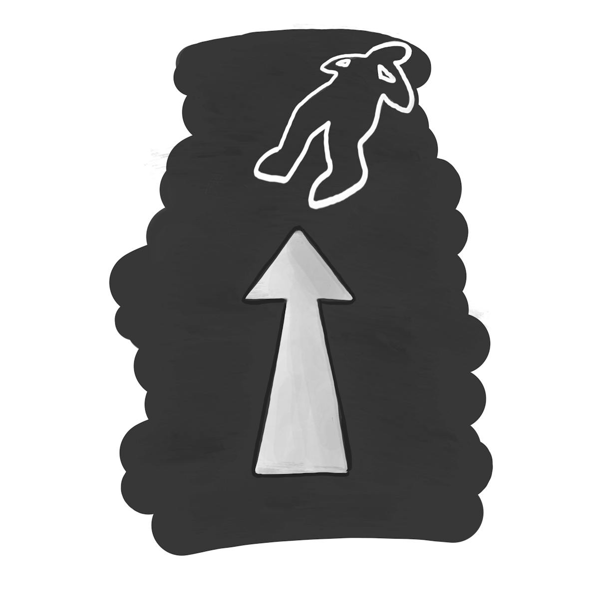 Meer heb ik er nadien niet meer van gehoord. Een week later, toen ik door de gang met pasta reed, zag ik dat er iets voorbij de pijl een of ander silhouet op de grond was getekend. ‘Nog schoner,’ dacht ik. ‘Als de kinderen hier nu na het eten ook al gaan beginnen spelen met stoepkrijt, hebben we het allemaal gezien!’ Opslag of niet, volgende week ga ik écht naar de Delhaize. Al blijf ik toch enorm sceptisch of dat wel kan werken, zo’n winkel zonder pijlen.