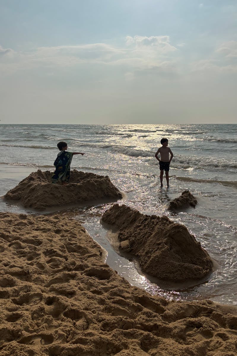 De zee was rustig, heel rustig. Toch sloop ze langzaam maar zeker dichterbij. Toen de zon in de late namiddag even door de wolken brak, besloten de jongens een duik te nemen in het koele water. Uitgelaten stoeiden ze in de golven, die stilaan oprukten naar het strand en hun piratenfort. Ondertussen vormden zich kleine geultjes die aan de muurtjes van hun bouwwerk knabbelden. Opgewonden kwamen de jongens teruggerend. Ook de donkere wolken naderden snel. Plots vielen er dikke druppels uit de lucht; strandgangers pakten haastig hun spullen en dropen af. Maar de jongens gaven niet op. Samen schuilden we onder onze grote strandhanddoek. Gefascineerd keken we toe hoe de zee langzaam maar zeker het strand weer in bezit nam. Toen brak de zon opnieuw door de wolken, en de jongens dansten opgewonden rond hun steeds verder afbrokkelende bouwwerk, tot het laatste zandmuurtje verslonden was en elk putje weer door de zee was ingenomen. We namen onze spullen en vertrokken. We keken nog één keer om: het grootste zandkasteel ooit was door de zee veroverd.