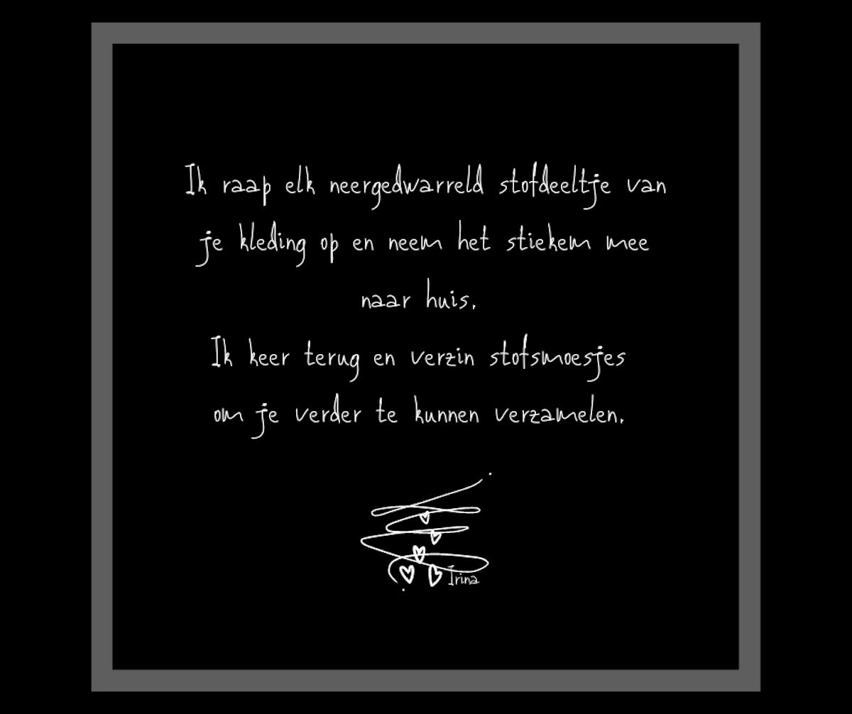 Ik raap elk neergedwarreld stofdeeltje van je kleding op en neem het stiekem mee naar huis.
