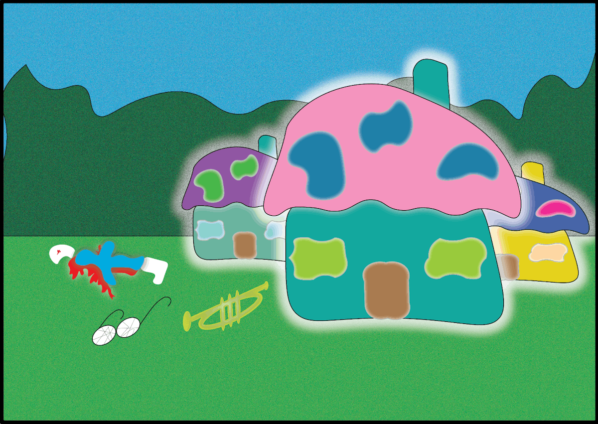 Schuivend op zijn buik wurmde Ernst zich tussen twee jonge dennenboompjes en stootte zijn neus aan een opgeblazen, groene paddestoel met een roze dak. Uit een schoorsteen kringelde rook. Tussen andere gekleurde paddestoelen schoten blauwe wezentjes met witte broekjes en mutsjes heen en weer.