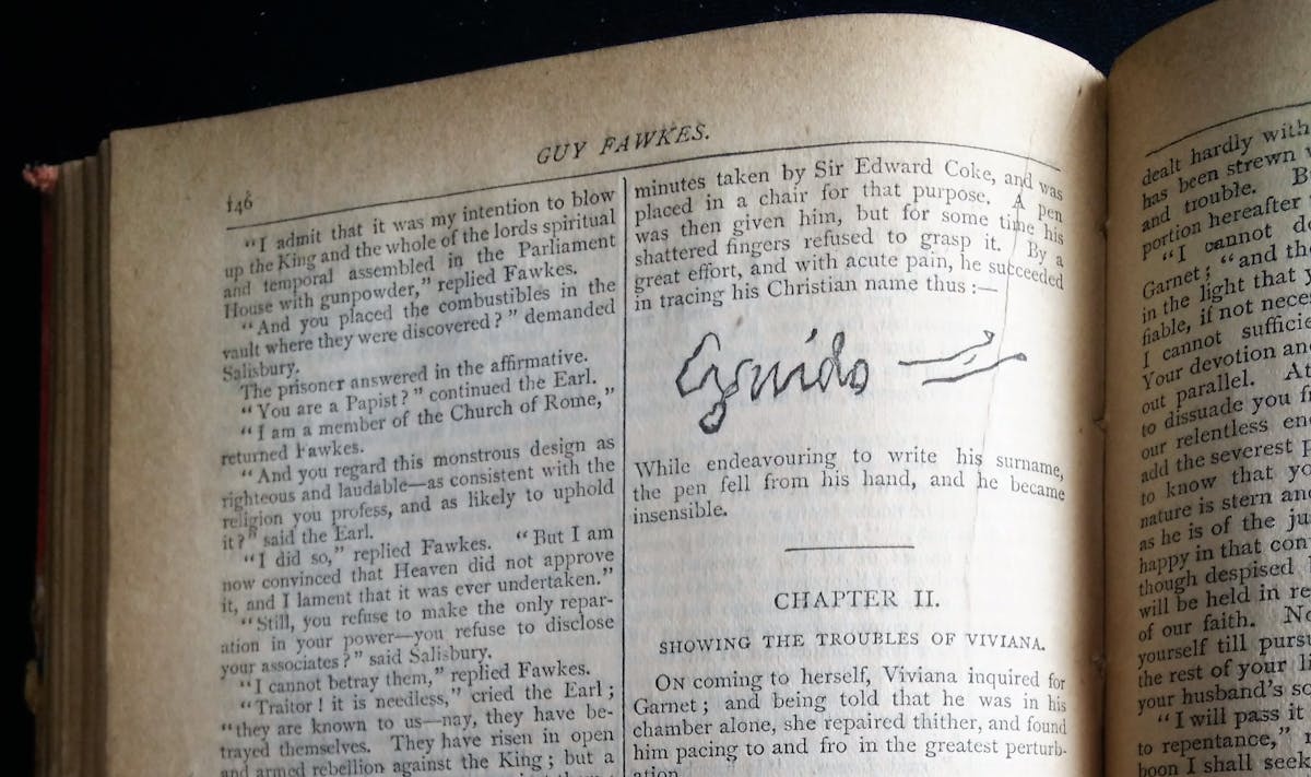Het boek was gedrukt in het voor dit soort lectuur meest gangbare lettertype maar ergens midden in het boek aan het eind van het eerste hoofdstuk over de marteling van Fawkes, hield plots de tekst op en stond er de naam “Guido” in handschrift.