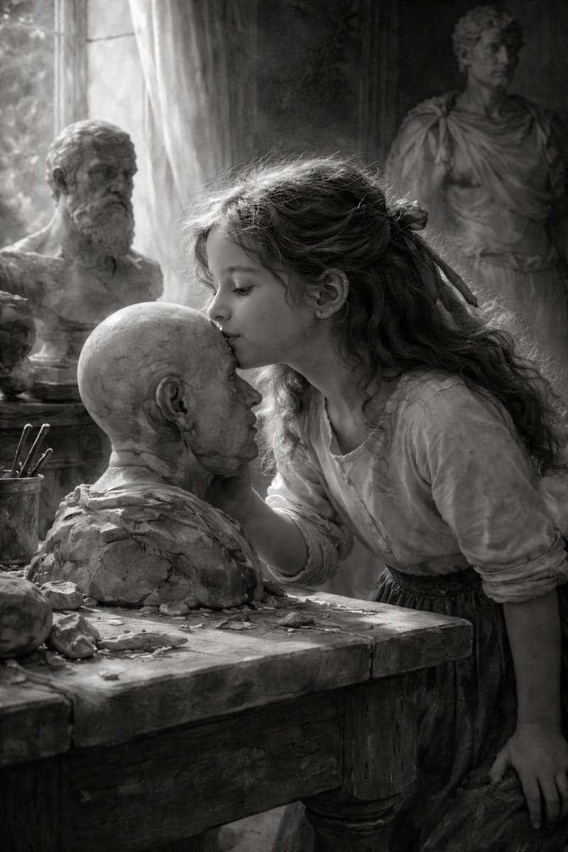 ze kust het kale hoofd en voelt zich vrij,