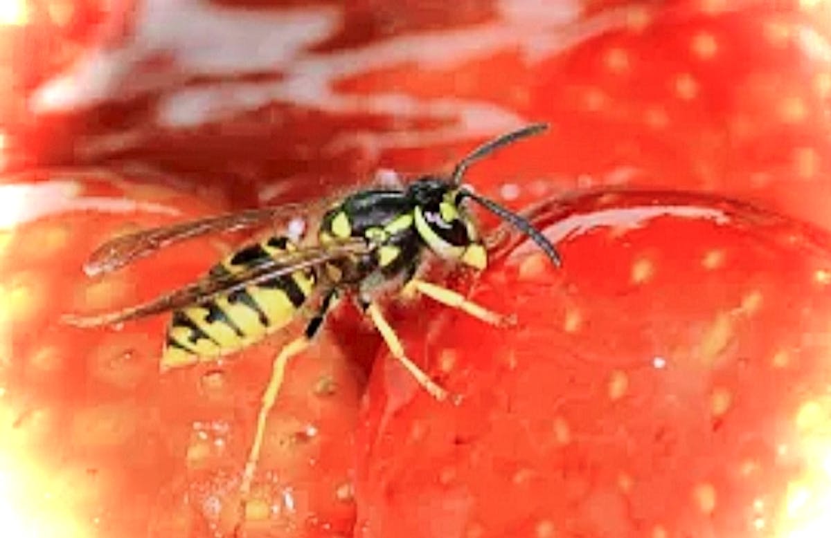 naar het schouwspel naar het brassen naar de wespen op het rood van warme taart en zwoele ondergang