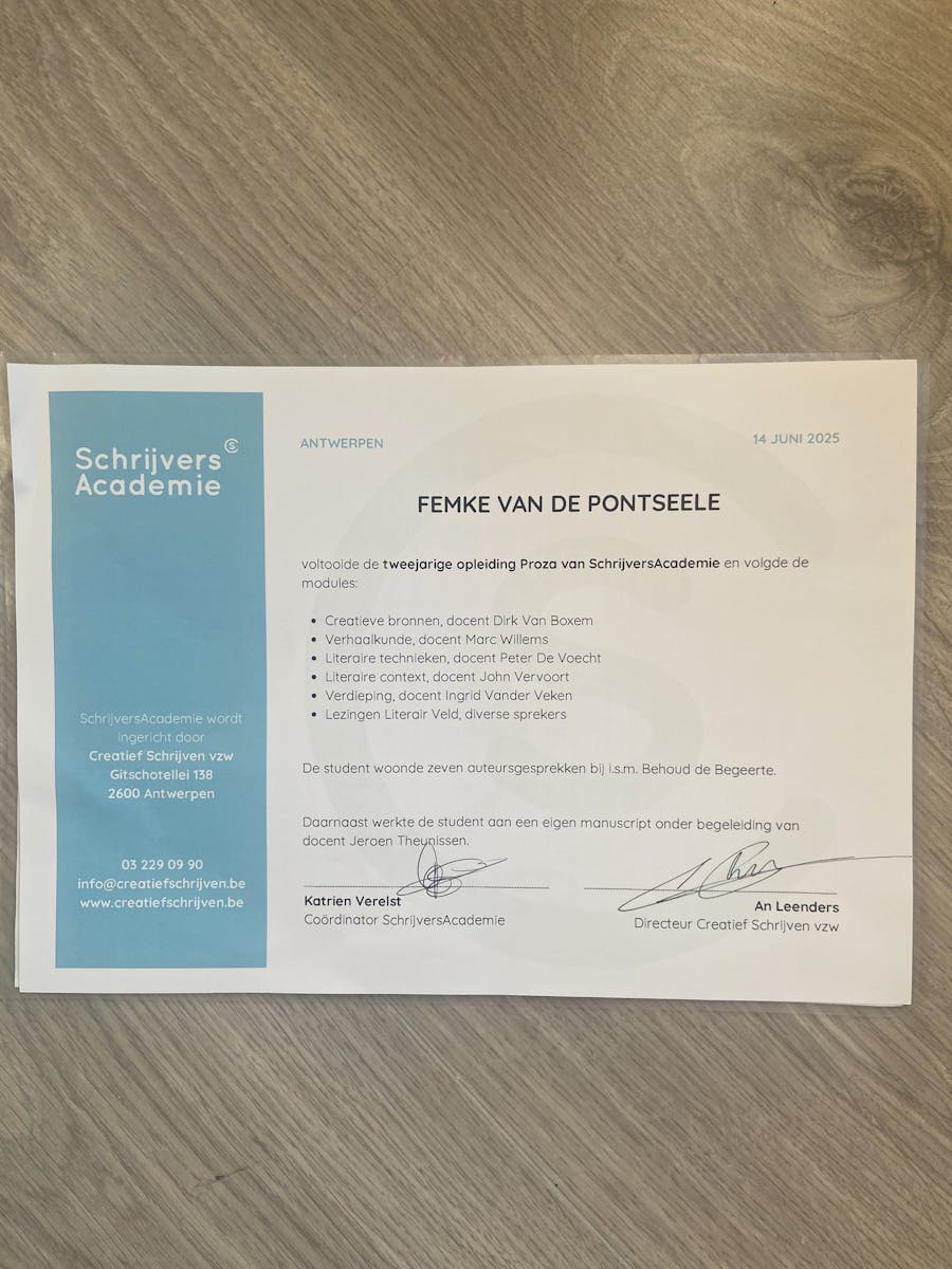 Hoera, sinds zaterdag ben ik een gecertificeerd schrijver. Bij De Schrijversacademie Antwerpen diende ik mijn manuscript 'Stekelvel' in. In dat verhaal reizen Nino en Lea op een tractor naar de begrafenis van Bubu, de baas van het café waar ze elkaar dertien jaar geleden leerden kennen. Op de slotavond van de Schrijversacademie las ik dit fragment voor: