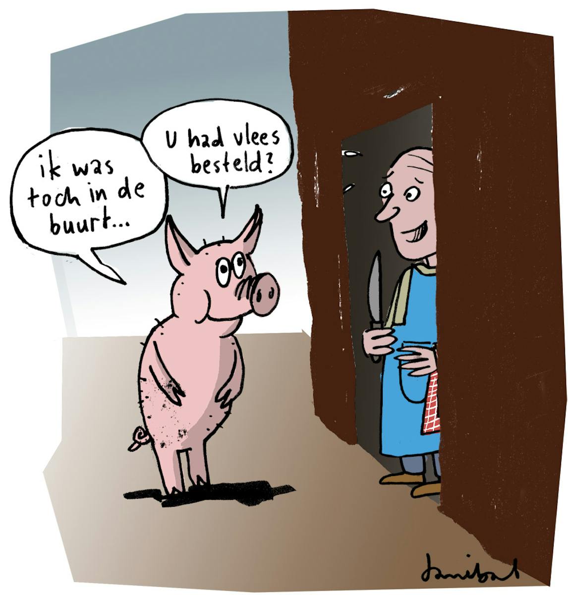 Overwicht, suikerziekte, hart- en darmproblemen lagen op ons bord, samen met dierenmishandeling, een boter- melkberg, een teveel aan methaan door die brave grazende zoogdieren met zachte ogen en de kippenpest. Het bewustzijn groeit moeizaam maar hardnekkig; we komen echt niets tekort. Voor al wat we niet tekortkomen wordt er enorm veel verspild. Het vlees wordt ons onpersoonlijk voorgesteld, netjes ingepakt in plastiekfolie. Zonder de organen, zonder het beeld van het dier dat hiervoor het leven liet. De supermarkten wassen hun handen in onschuld omdat wij allemaal Pontius Pilatus zijn.