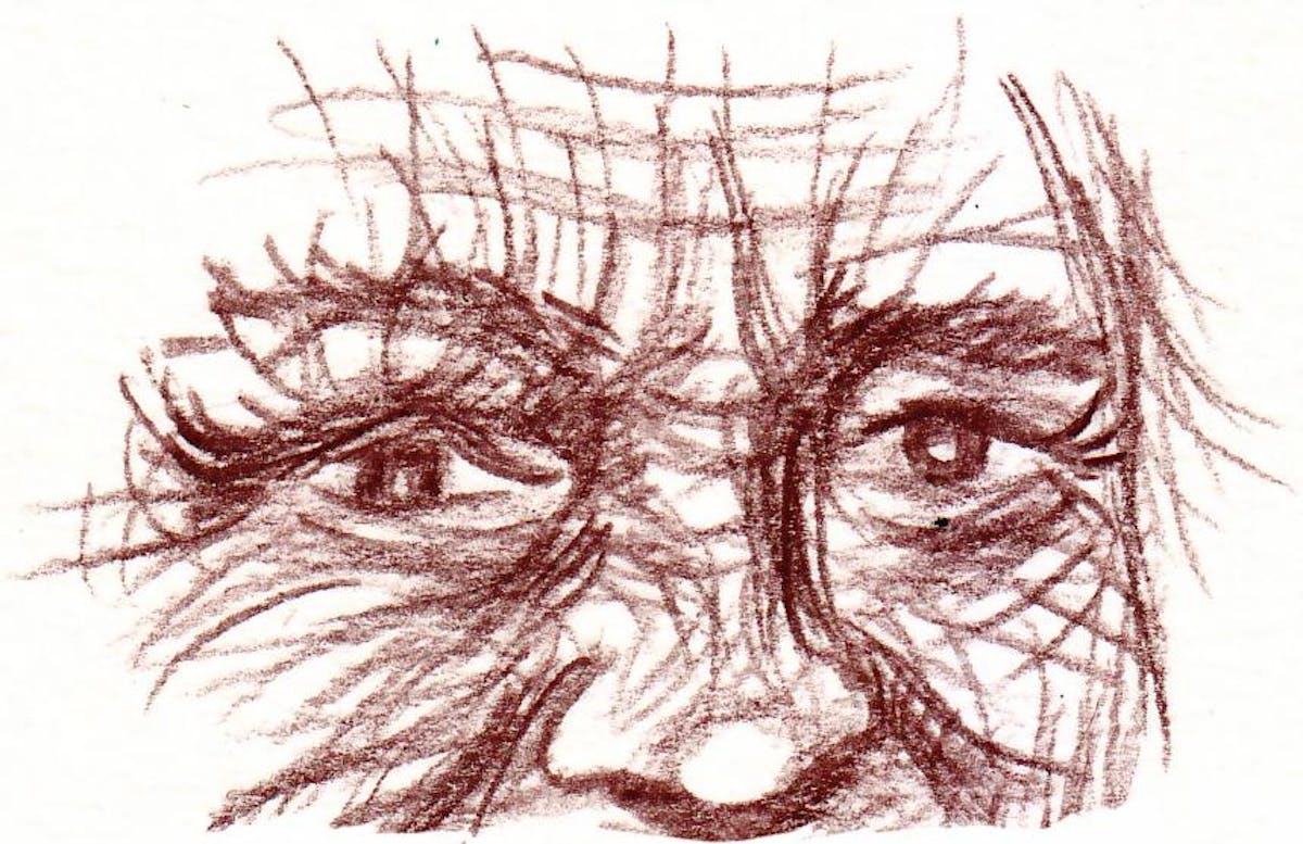 Iemand die meninkjes in een zin samen met wereldvrede gebruikt, heerlijk. Het woord 'Klingon' moet ik opzoeken, Star Trek ken ik alleen van naam. De afbeeldingen van de fictieve humanoïde soort brengen geen uitsluitsel of de drie millimeter diepe centimeter horizontaal of verticaal over het voorhoofd van de auteur loopt. Hij of zij is geboren met de frons. Zo'n gezichten ken ik ook, ontdekte ik sinds ik terug portretten teken.