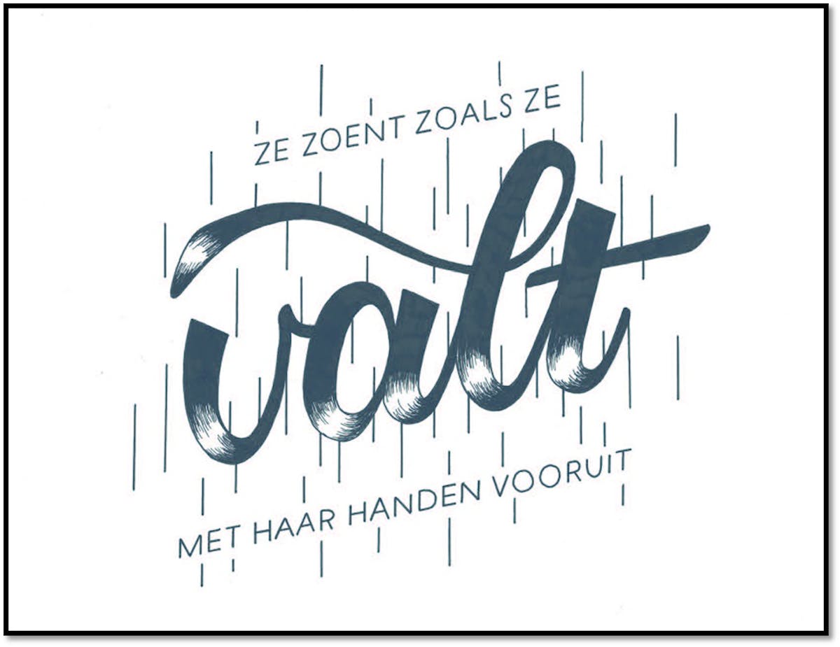 Typografe Geertrui Storms maakt van de zes geselecteerde zinnen een unieke reeks postkaarten die we onlangs op de Schrijfdag in Oostende presenteerden. De Schrijfdag-deelnemers stemden Luc Vanhelmont tot publieksprijswinnaar met de zin 'Wat af is heeft aan traag genoeg'. Je kunt deze unieke reeks nabestellen op www.creatiefschrijven.be/postkaarten-de-zin-van-je-leven/.